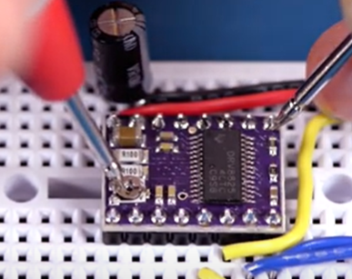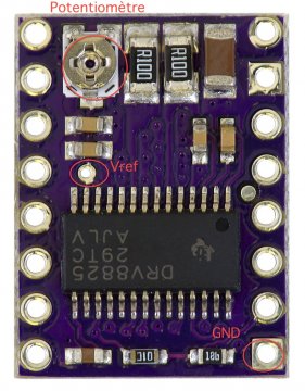 La méthode en résumé/simplifié : moteur débranché, on mesure au voltmètre Vref par rapport à la masse (Vref est accessible via un trou traversant). Le courant maxi est défini par Imax=2xVref (Imax en A, Vref en V). On régle le potentiomètre pour obtenir Vref voulu. Ensuite, on branche le moteur (maintenu à l’arrêt, pas de commande STEP) et on vérifie l’intensité sur une des phases. Si besoin, on la règle à nouveau avec le potentiomètre.